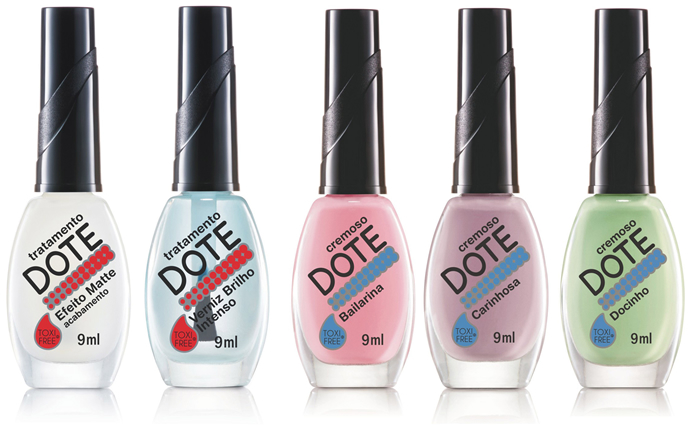 Chegaram por aqui alguns esmaltinhos lindos da coleção de Verão da Dote , 4 cores mais um extra-brilho e uma base fosca.
